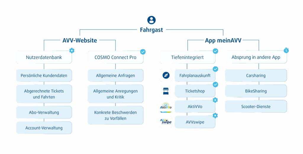 Die meinAVV-App bildet das Herzstück unserer Mobilitätsplattform im Rahmen des Modellprojekts. Schon heute steckt viel drin – und es kommt noch mehr! Mit der praktischen AVVswipe-Funktion, geplanten Integrationen von Angebote wie AktiVVo und swabi und einer stetigen Weiterentwicklung im Sinne der Nutzerfreundlichkeit wird die App immer besser – für alle, die unterwegs sind.