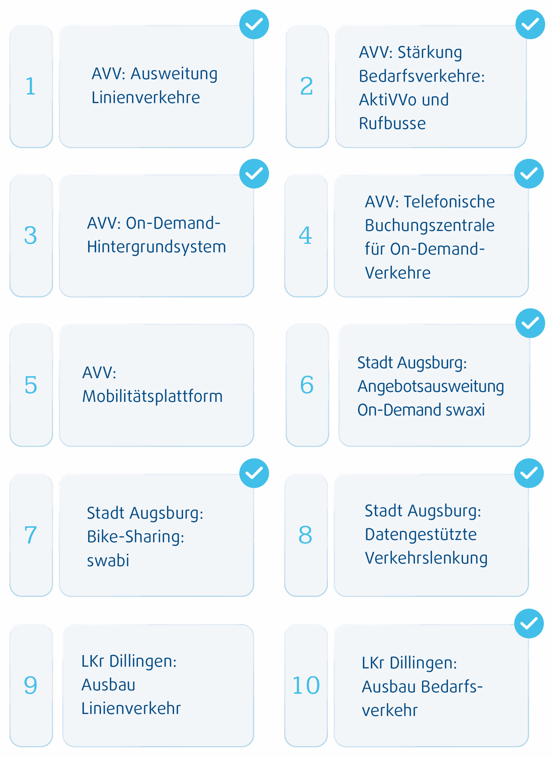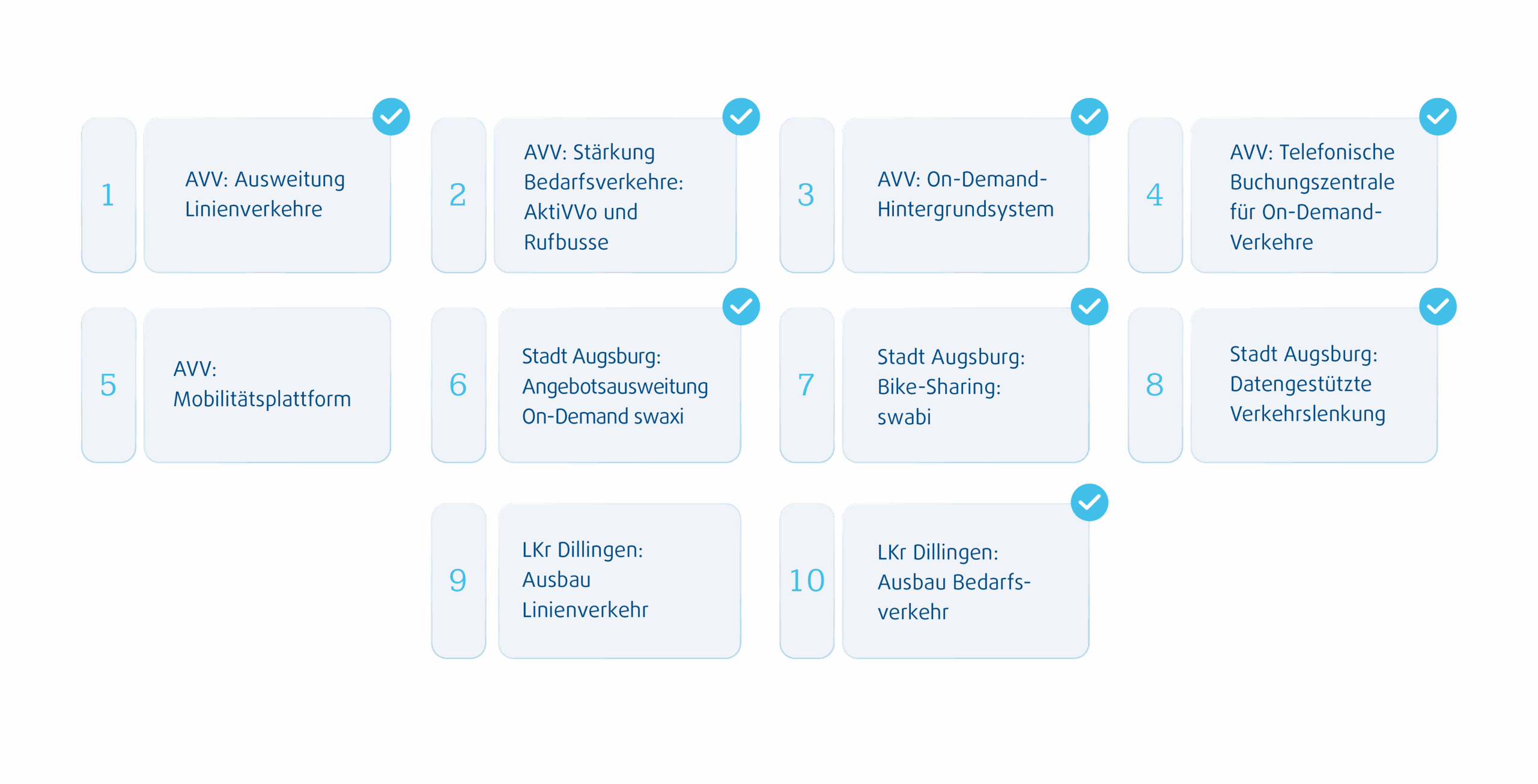 Mit der ersten Stufe des RegioSchienenTakts 2007 zwischen Bobingen und Augsburg sowie weiteren Verbesserungen 2008 auf den Strecken Donauwörth/Dinkelscherben – Augsburg und Friedberg – Mering, wurde der AVV-Regionalbusverkehr optimal mit dem Schienenangebot verzahnt. 2008 startete außerdem der erste Nachtbus in Bobingen und wird 2009 nach Schwabmünchen und Welden ausgebaut – für noch mehr Flexibilität. Und schon 2010 startet mit dem ersten Rufbus in Meitingen das erste „On-Demand-Angebot“.