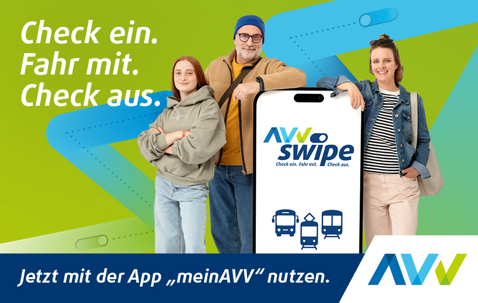 Im April 2025 war es so weit: Mit AVVswipe startete der AVV ein völlig neues, digitales Ticketmodell – direkt integriert in die meinAVV-App. In der ersten Phase ging das Angebot im gesamten Verbundgebiet an den Start – also in allen Bussen, Straßenbahnen und Regionalzügen. Bis Ende des Jahres sollen auch die beliebten AktiVVo-Fahrten über AVVswipe möglich sein. Eine Integration der Anruf-Sammel-Taxis (AST) ist aufgrund der fehlenden Möglichkeit zur Fahrwegerfassung leider nicht möglich.